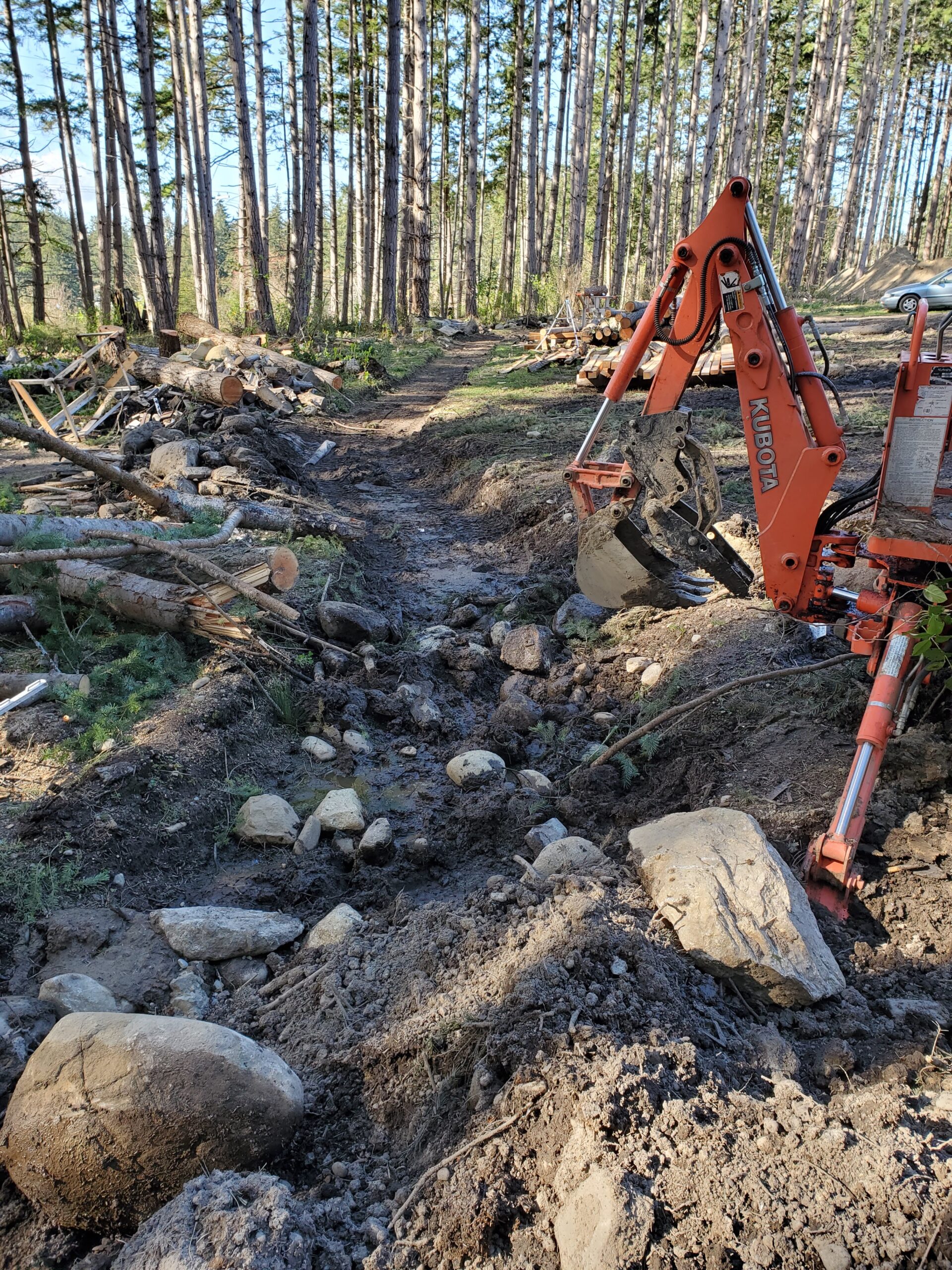 Jeff began the search for a 5 ton excavator, a trailer, and a truck to pull it all. With the machine he purchase 3 buckets and an auger. Jeff began to see the potential in his backyard. The potential to remove all the stumps from his property, to buck all the logs up, to grade and install grass and a rock wall. What if other people had backyard with similar potential?